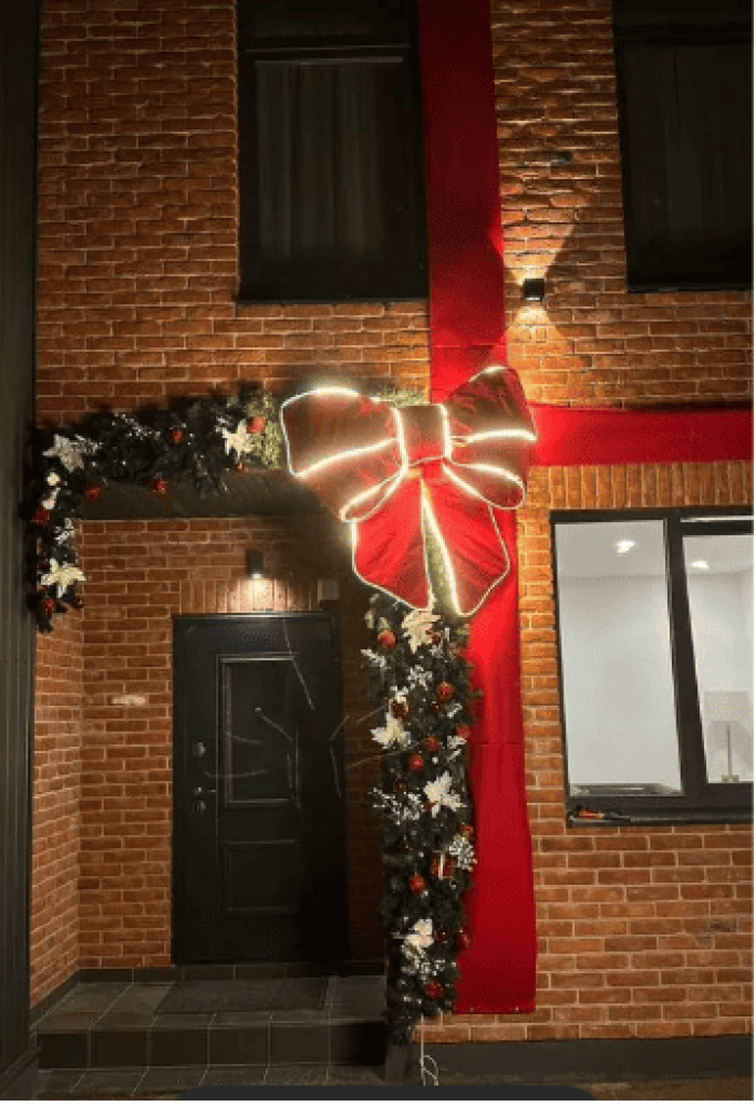 Большой праздничный бант с подсветкой и лентами для двери дома