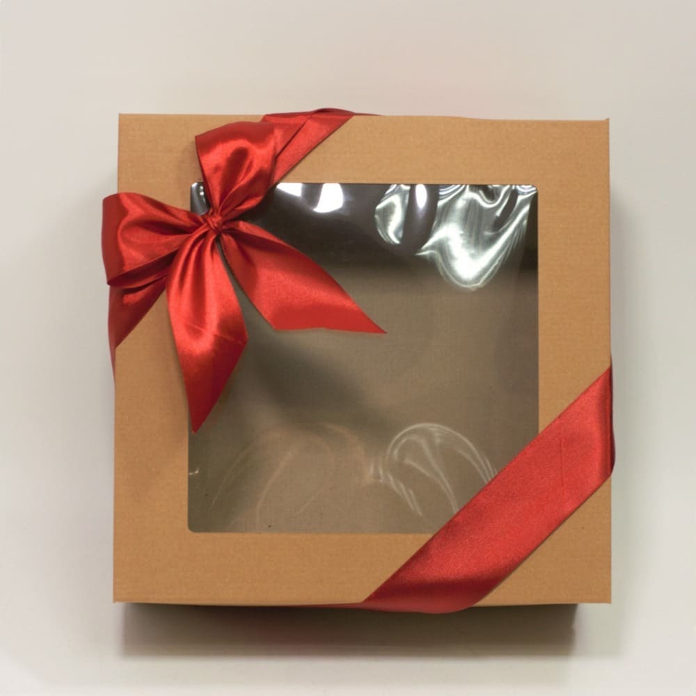 - Премиальные коробки с прозрачным окном и лентой;