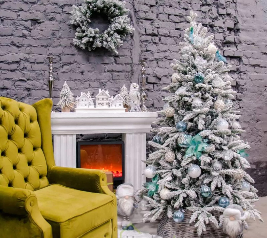 - Заснеженный эффект — белоснежный налет на ветках создает праздничный зимний вид.